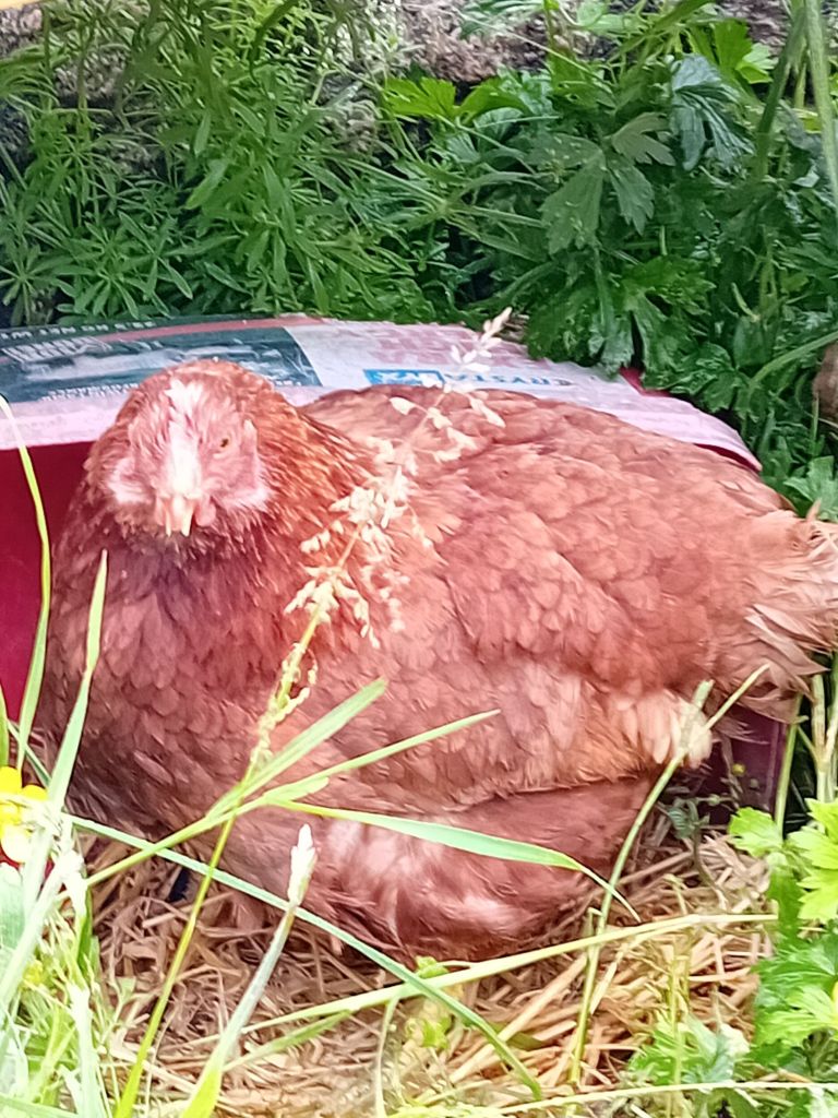Peri is living a charmed life. As a Rhode Island Red with mobility issues, there are many lives she could have lived that would have been shorter than the one she is currently enjoying. No one is quite sure what the exact problem is, but she has a bad limp that means she can no longer scratch and forage like the other chickens. The others had taken to pecking her, seeing she was weak, so during the day she is relocated from the coop halfway down the hill to the first garden with the benches, where we have coffee breaks and meals when the weather allows. During the night, she has her own small section of the coop where she cannot be victimized.