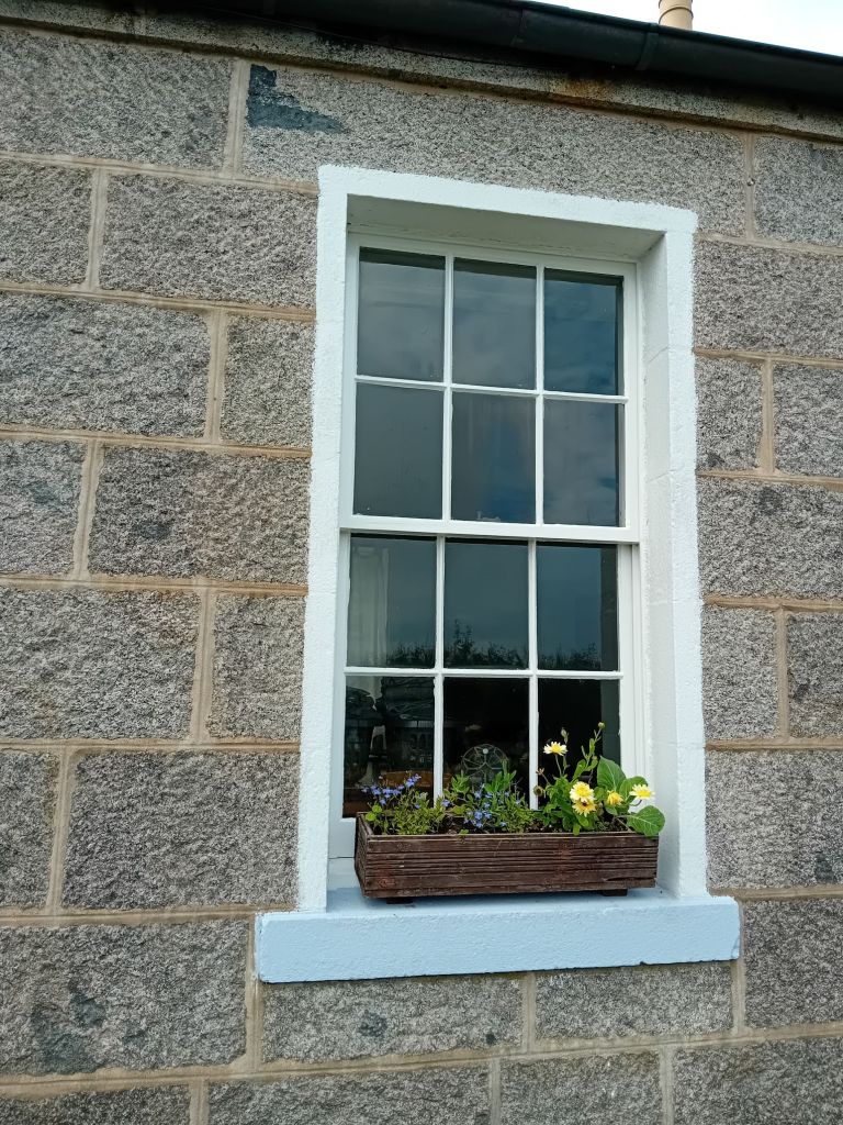 The houses are semi detached, single story cottages, built of the same slivery grey/black as the lighthouse. There are heavy, hard wood doors with thick bolts to keep them shut. The windows are generous to the north and shrink towards the south, where the new kitchens and bathrooms are. The wide fireplaces that were once open still have huge clothes airers, hoisted on ropes, above them. Cottage number one used to be a school for the lighthouse builders and keepers children, and also for other local children that made their way across the narrows each day from the mainland. After lessons, the children would help in the gardens or any other domestic tasks. When they were done with that a fair few would be seen running around the perimeter walls that act as much-needed wind breaks for the crops.