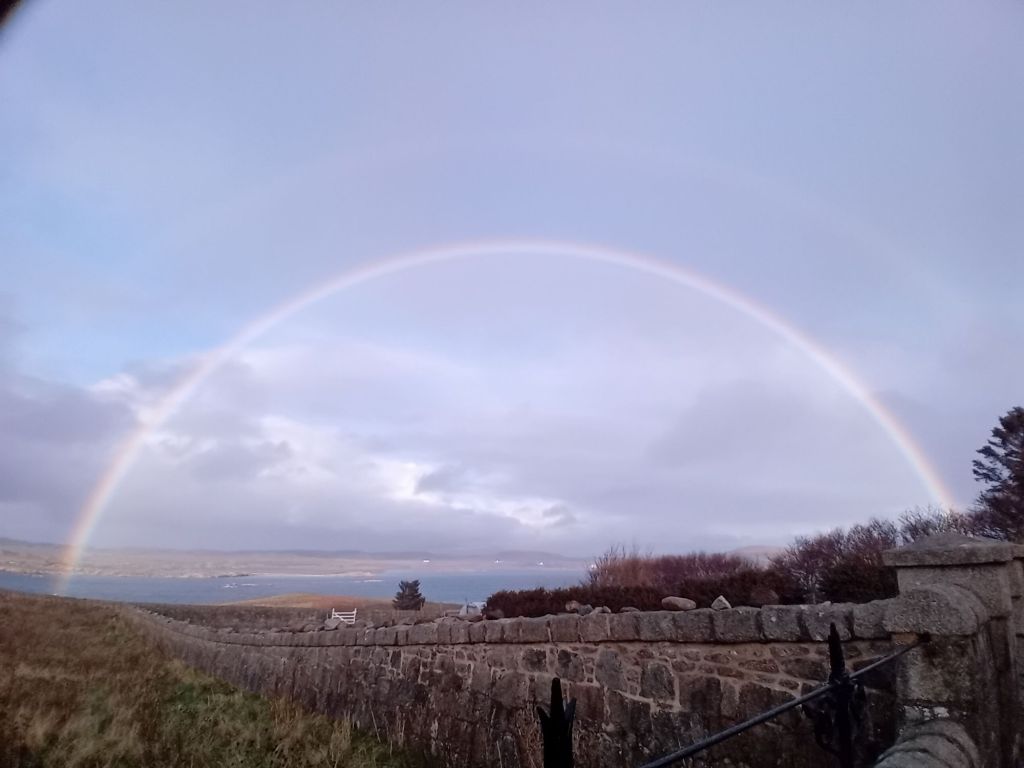Daylight on Saturday brought sights that could have been much worse, had it not been for the granite walls of the gardens and houses. Two of Judy’s trees at the croft were down, and her son Tom was reportedly spread-eagled on the roof of his house in the middle of the storm, trying to save his new solar panels from flying away. The purple kale and broccoli were flattened, but the polytunnels had come through unscathed. Amy hadn’t finished, though, and all through the day the winds were such that you had to really want or need to be out. Outdoor errands were brief scuttles to the communal kitchen, which became our natural meeting place as it had the only gas cooker on the island. Without any organisation, we coalesced for breakfast; porridge and coffee were made and shared as we reflected that the chances of receiving new guests were nil. Schedules went out of the still-shaking windows.