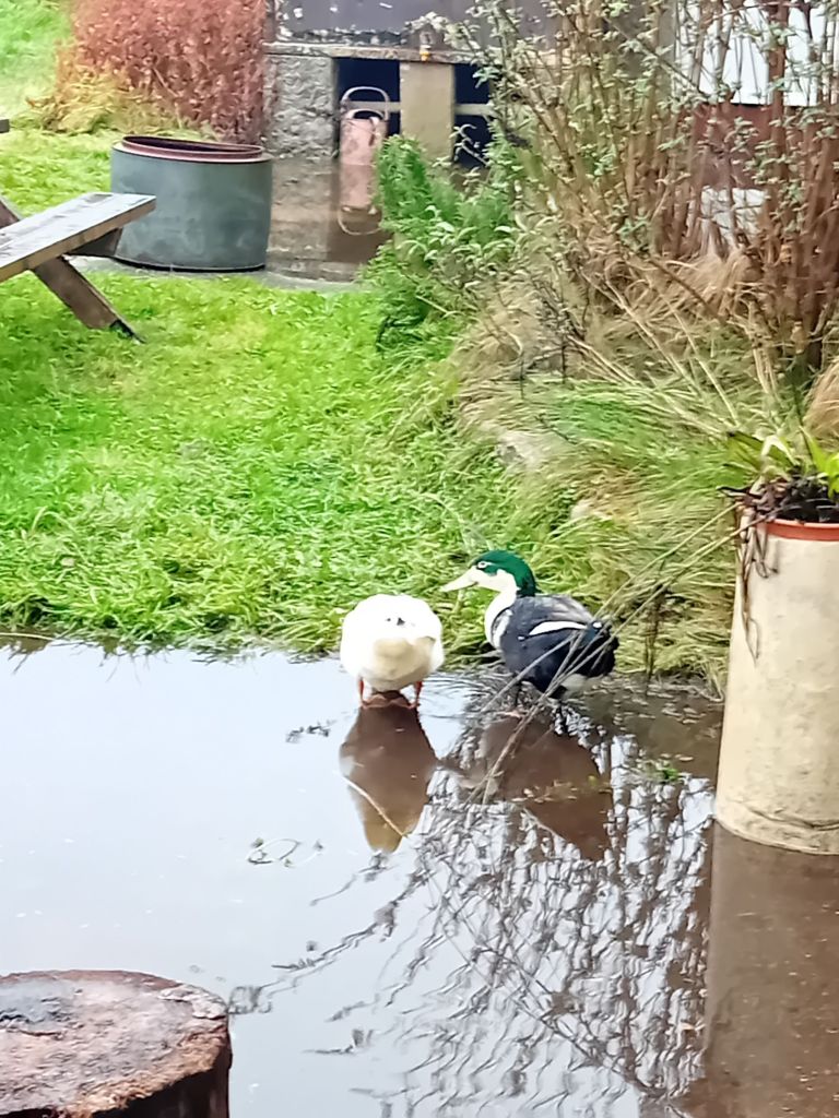 Back home, I slew off my clothes and get comfy dry, confident that the trials of this wettest of days hold no other watery surprises. Opening the shutters that I’d forgotten about earlier in my haste to get going I do a double take. Instead of the patio that leads onto the lawn the ducks are enjoying a their new pond.